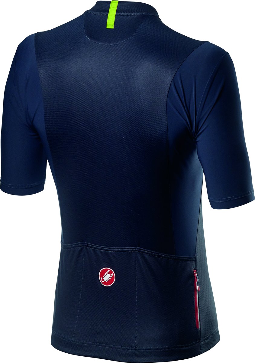 The Unlimited Jersey uses everything we know about moisture management, fit, shape, and the convenience of zippers that open easily and pockets that are the right shape and in the right place. But on this jersey we took the extra step of using fabrics that better resist snags from tree branches or vines that you'll find on your favorite trail. The main body fabric is a polyester knit with good stretch and moisture management but better durability than the typical fragile fabric that's OK on the road. Then on the sleeves, shoulders and back panel we use a stretch woven fabric that is extremely resistant, since this is the area that most often gets snagged. You'll just be comfortable like you always are in Castelli, but you'll look good all season long.